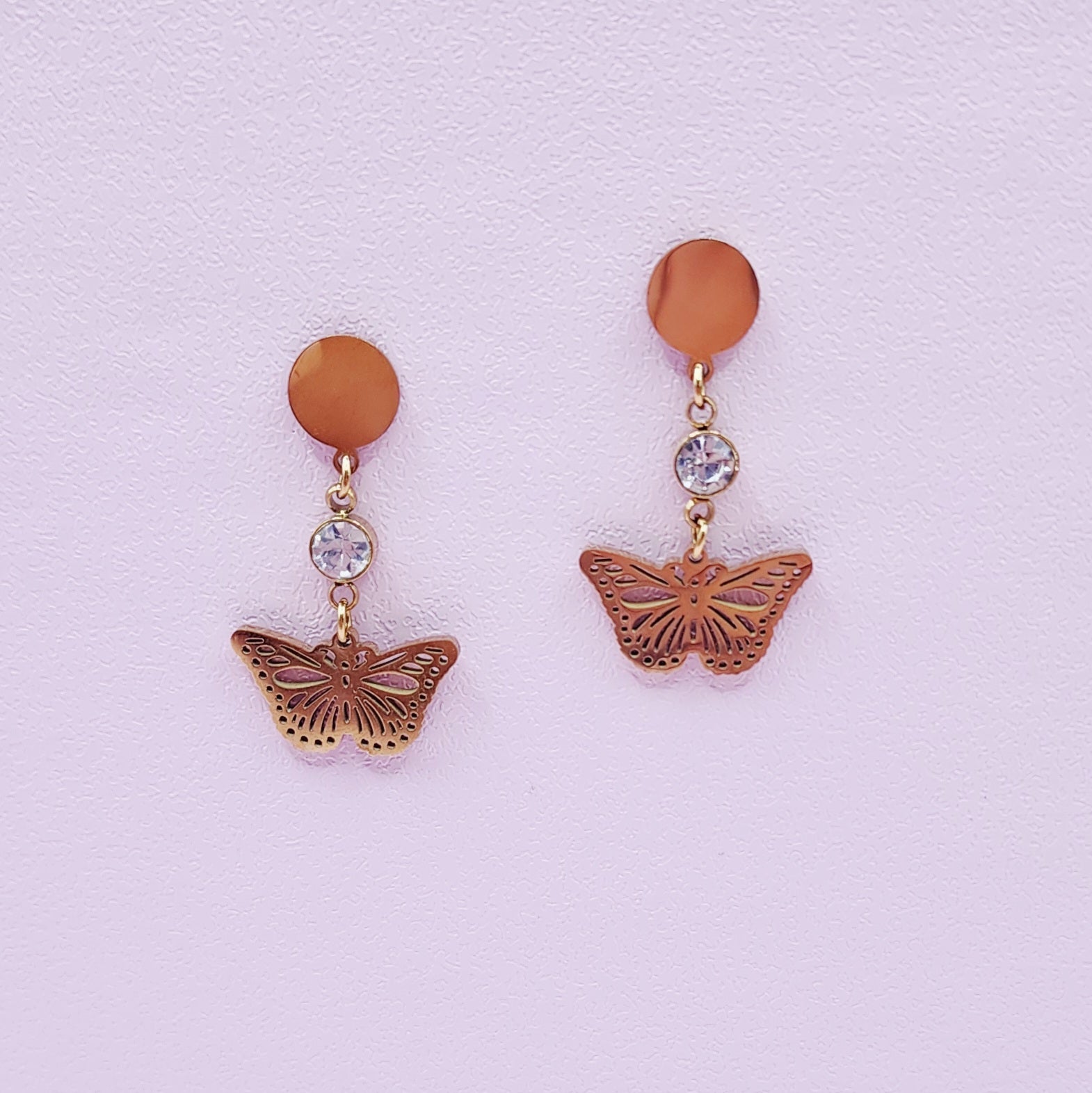 Disponibles en acier inoxydable doré ou argenté, elles se composent d'un clou d'oreille rond minimaliste, rehaussé d'un strass brillant et d'un pendentif en forme de papillon ajouré.
