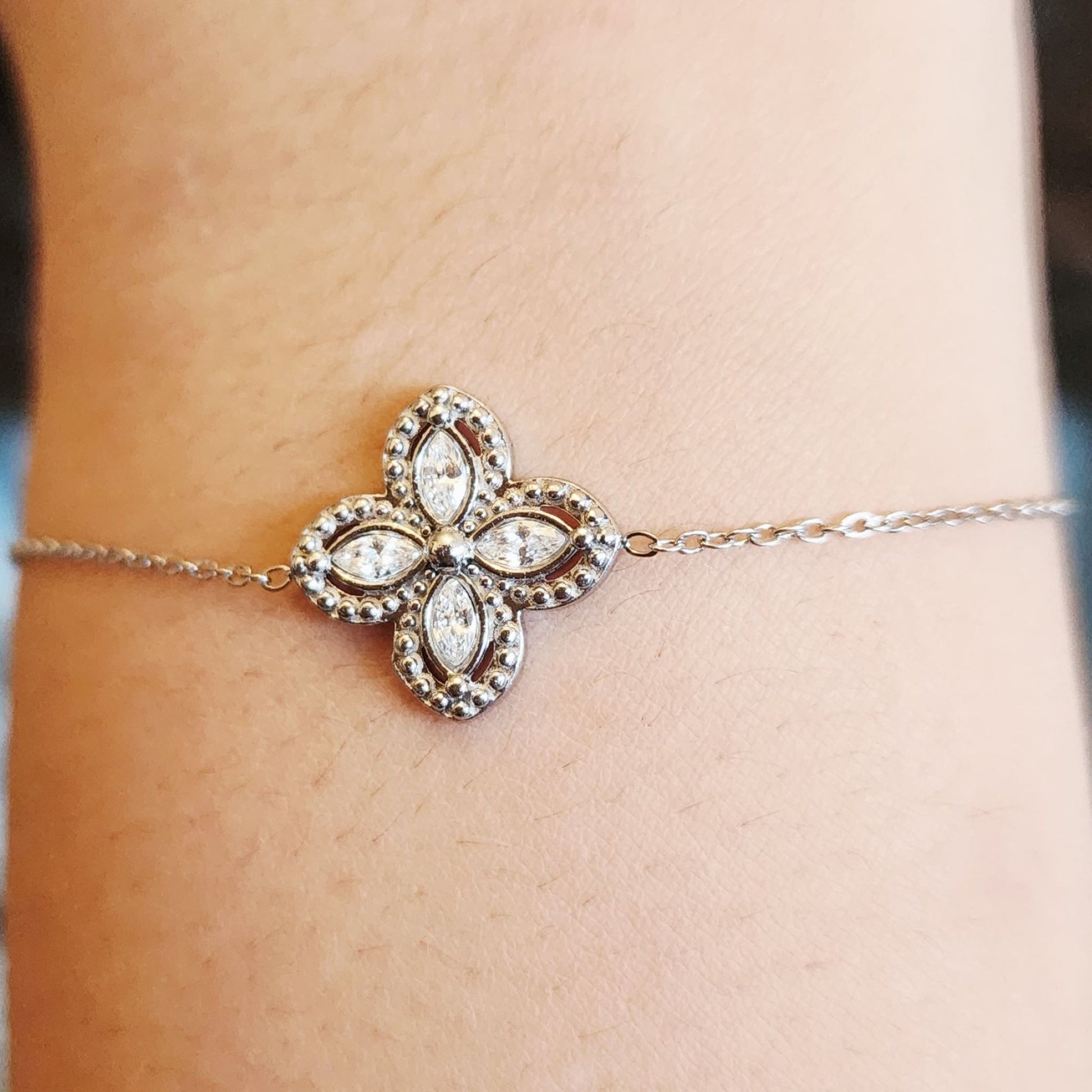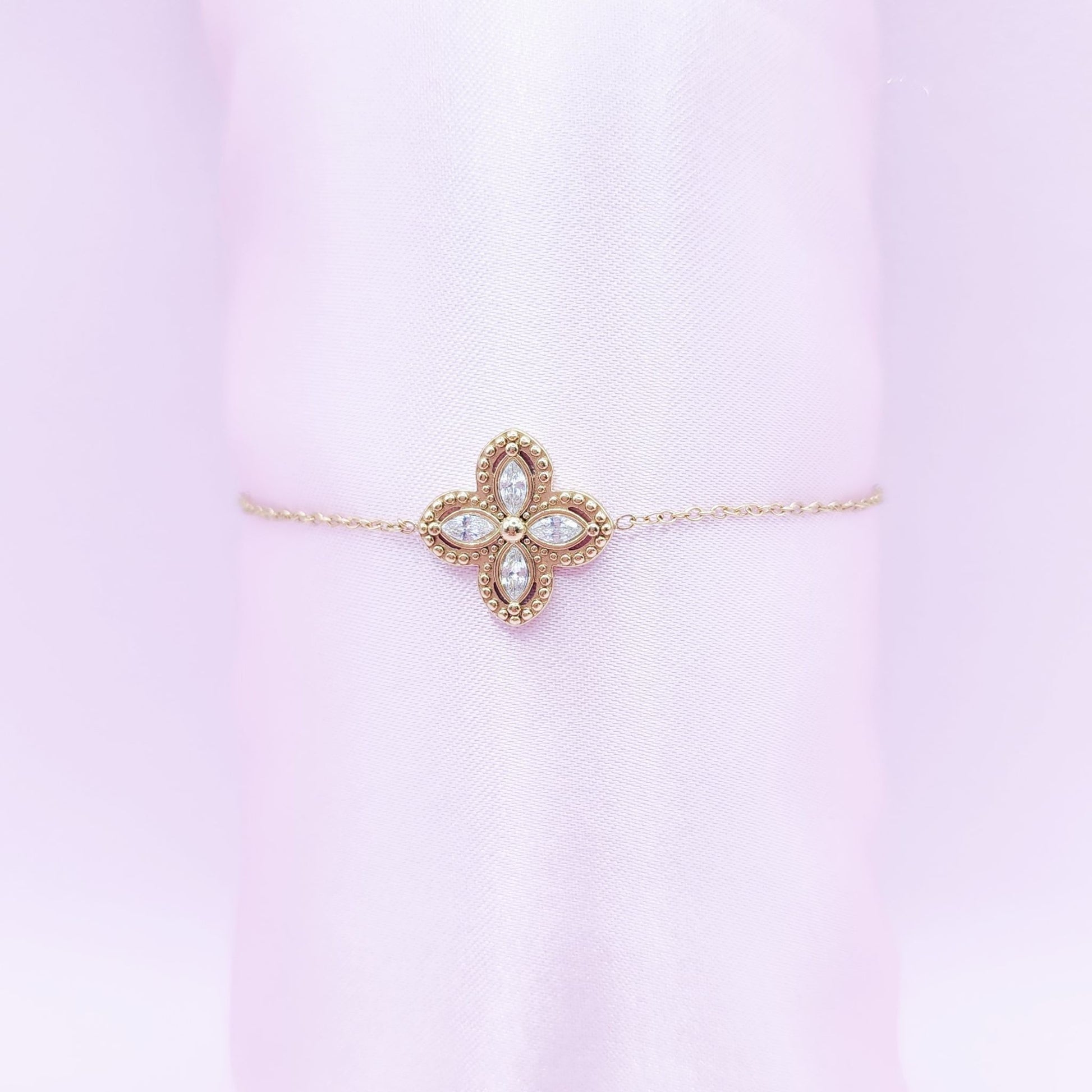 Découvrez notre bracelet Louisa en acier inoxydable doré, orné d’un motif fleur à quatre pétales entièrement strassé.